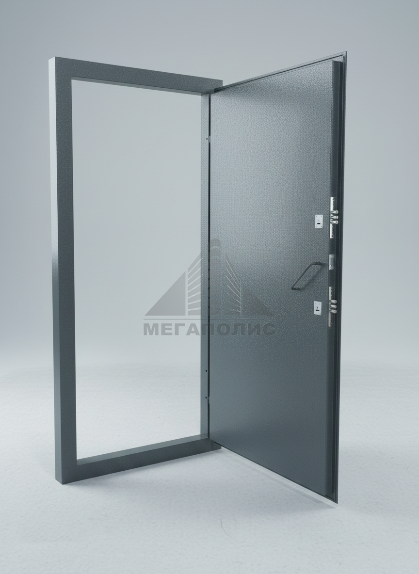 Стальная дверь из 2х г/к листов – внешний лист 3 мм, внутренний лист 2 мм, с двумя врезными замками 4 го класса защиты, основной - типа Эльбор Сапфир (либо аналог), дополнительный - Фуаро (либо аналог), разные по секретности. Возможен вариант установки одного врезного замка и дополнительно петель под навесной замок снаружи полотна. Ручки-скобы приварные, Полотно двери многослойное первый лист г/к 3 мм. внутри полотна расположены ребра жесткости не менее 2х шт. Полотно проваривается прерывистым швом Приспособление для опечатывания, противосъемные ригели. 3 шарнира на створке проваренные сплошным швом, без окна или с передаточным окном (Передаточное окно в металлической двери не более 300х200hмм, с замком и горизонтальной фиксацией 90ᵒ во внутрь, отверстие под ключ только изнутри). Рама полотна и диагонали из уголка 35х35 мм внутри полотна провариваются прерывистым швом по внешнему и внутреннему периметру.