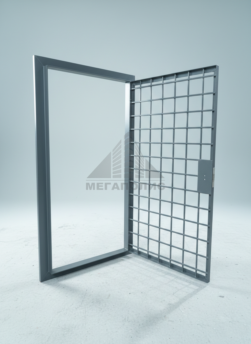 Решетчатая дверь из прута диам. Не менее 16мм с размером ячеек не более 150х150 мм прут в местах пересечения решетки проваривается с 4х сторон, в каждом месте пересечения квадратов и соединения с профилями провариваются прерывистым швом. Периметр из прута диам. 16мм проваривается прерывистым швом. Врезной замок Фуаро 3го-4го класса защиты (или аналог) с ригелями по площади поперечного сечения не менее 3 см2., Защита замка пластиной и стали 3 мм, без окна, по периметру решетчатая дверь обрамляется стальным уголком не менее 35х35х4, 3 шарнира на створке проваренные сплошным швом, противосъемные ригели рама у обеих дверей из уголка100х100х7 цвет по стандарту RAL
