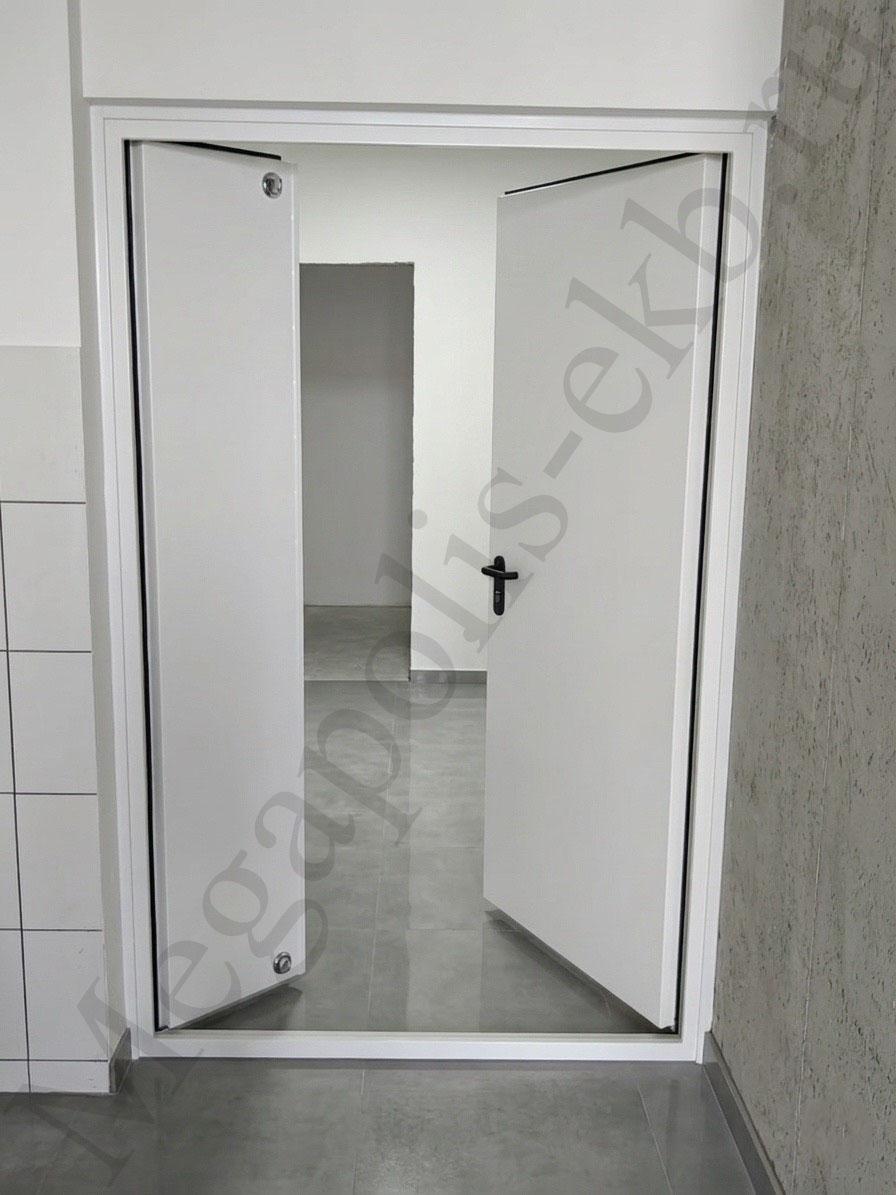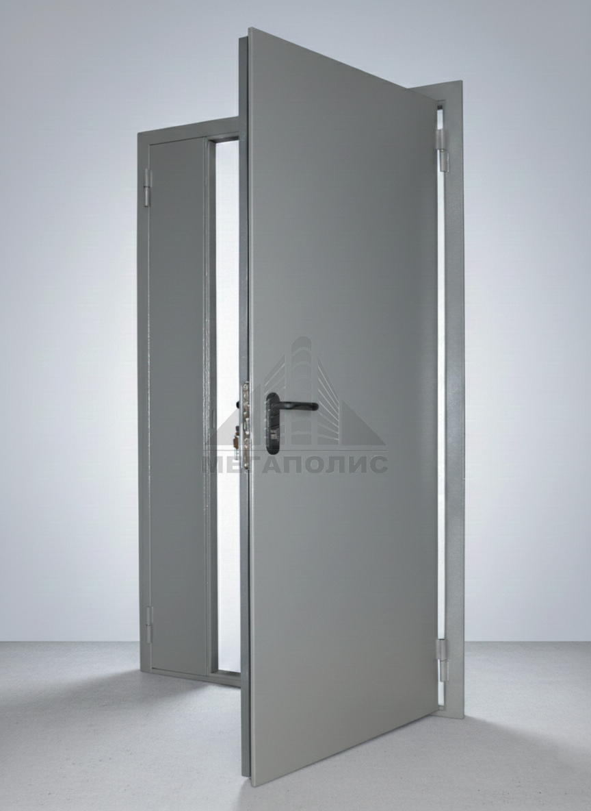 Дверной блок состоит из полотна и угловой коробки. Материал дверной коробки комбинированные стальные профили, дверное полотно изготавливается из листовой стали, толщиной 1,2 мм. Коробка и дверное полотно равномерно заполнены минеральной плитой.